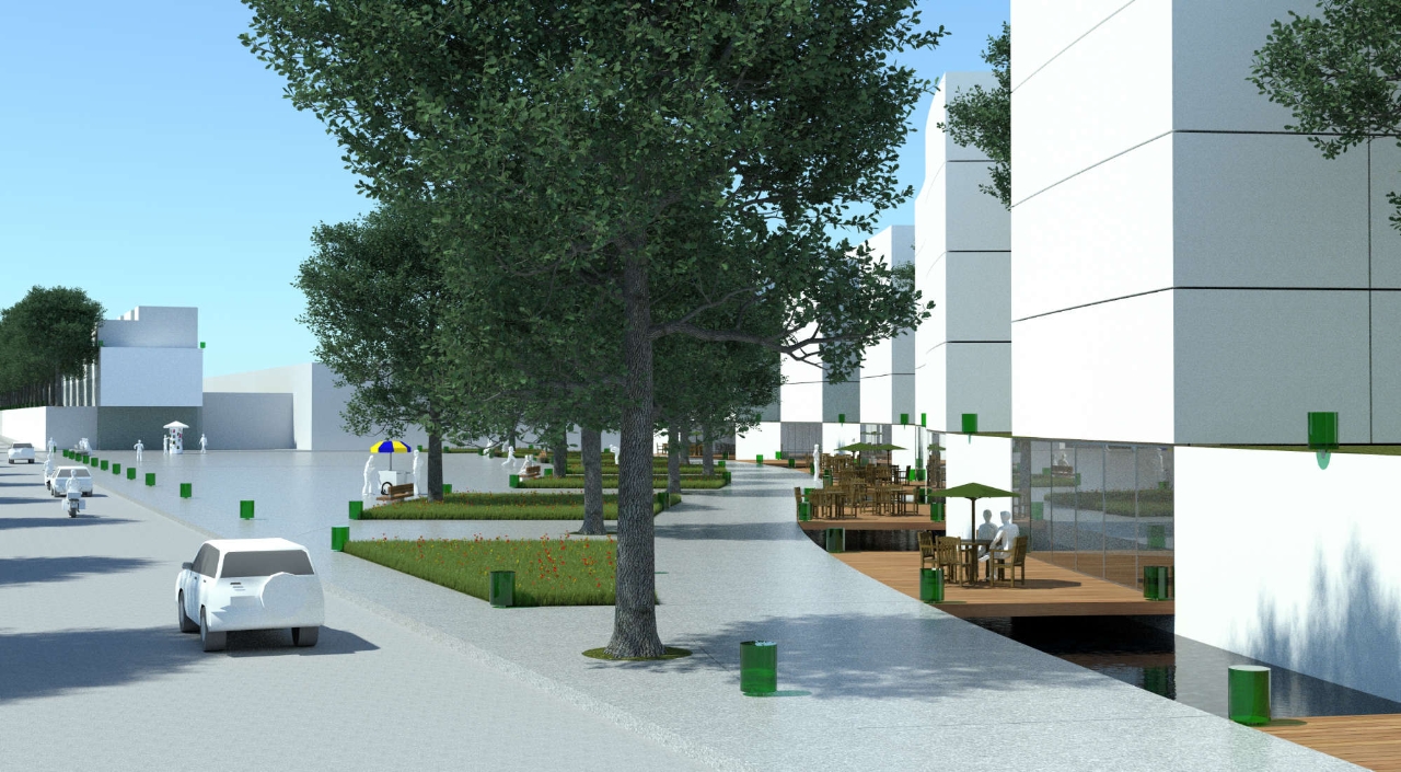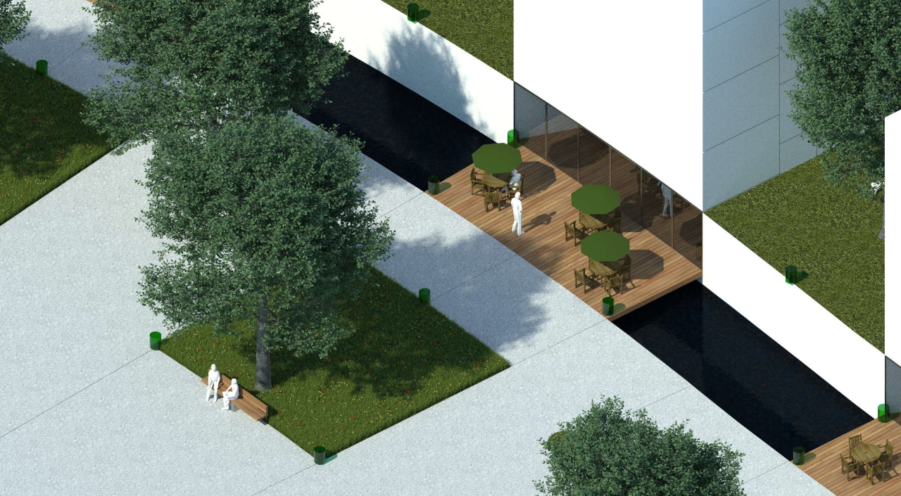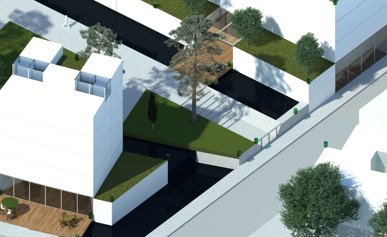 Un jardin intérieur d'arbres, d'eau et de lumière L'arbre garde les seuils de chaque maison, il protège en douceur les domaines de chacun L'eau réécrit à une échelle réduite tout le vocabulaire hydrographique de la campagne : la source, le ruisseau, la rivière, les îles, et délimite sans violence les territoires de tous et de chacun; La lumière, à l'image des feux devant les cavernes ou des antiques porteurs de flambeaux, illumine ces limites et structure jusqu'à son échelle la plus fine tout l'espace de l'ilot. |