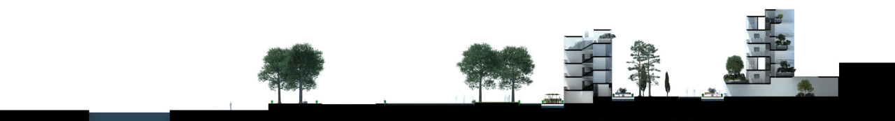Coupe transversale sur les appartements traversants en demi-duplex, les terrasses des commerces sur la place et les entrées des maisons |