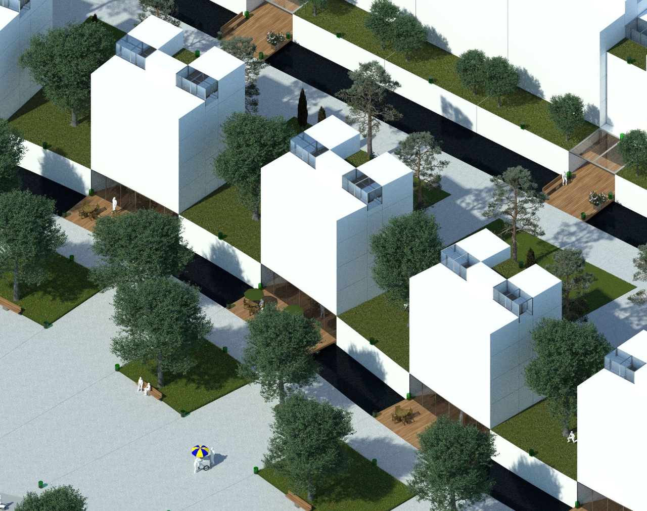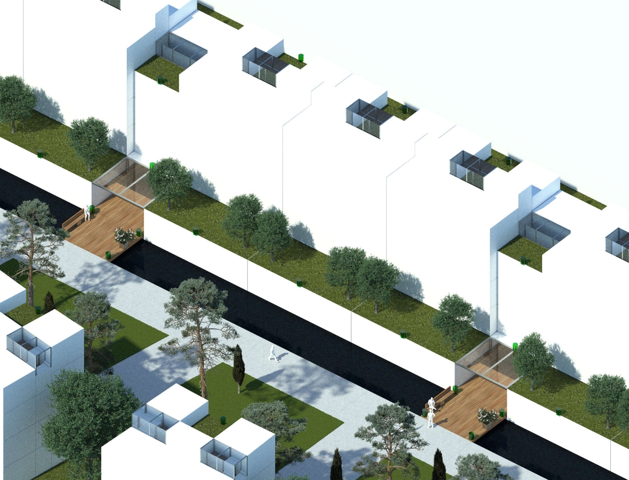 Les maisons en plot entre jardins en terrasse, place et jardin intérieur |