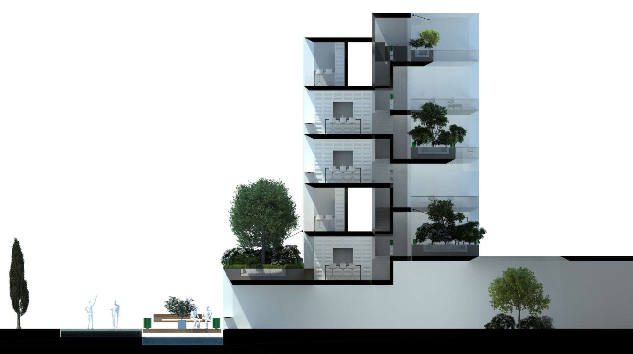 Coupe transversale sur les appartements traversants en demi-duplex et les entrées des maisons |