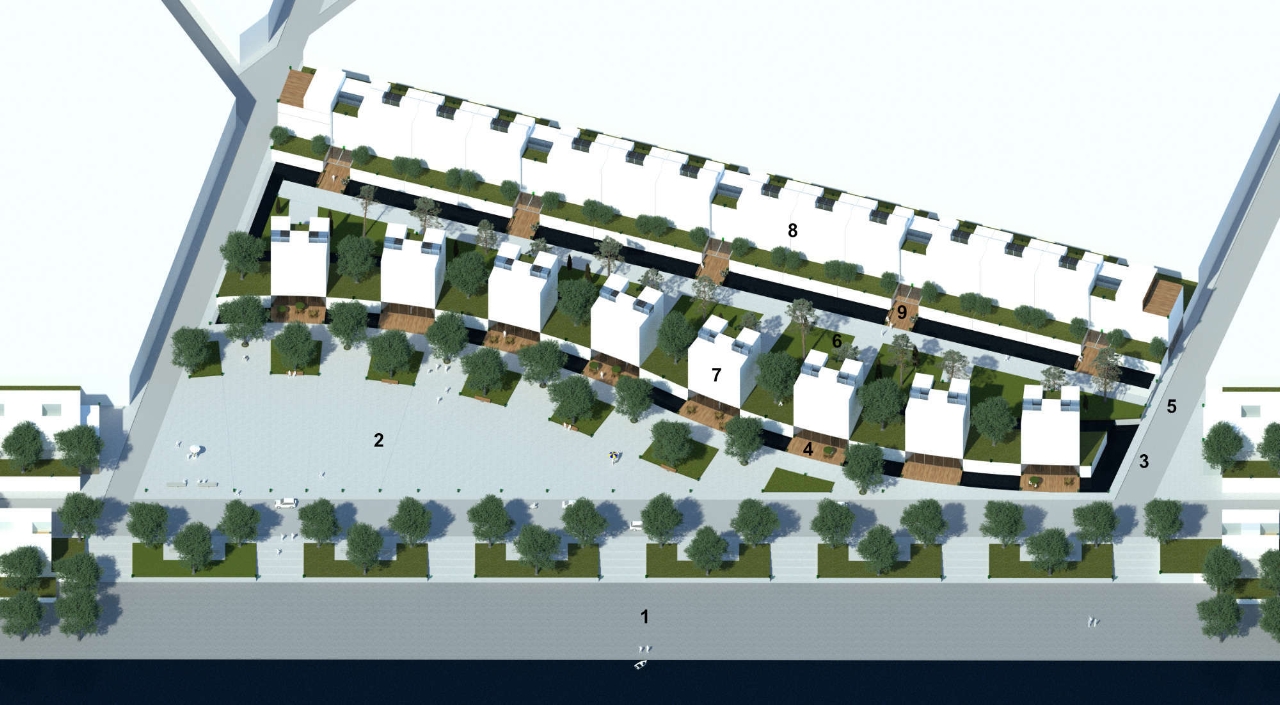 1 le canal, 2 la place sur le canal, 3 la rivière, 4 les terrasses des commerces, 5 l'entrée principale, 6 le jardin intérieur, 7 les maisons en plots, 8 les maisons en bande, 9 les entrées des maisons |