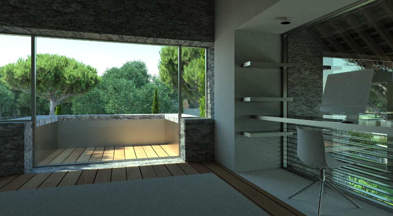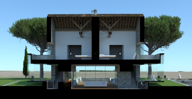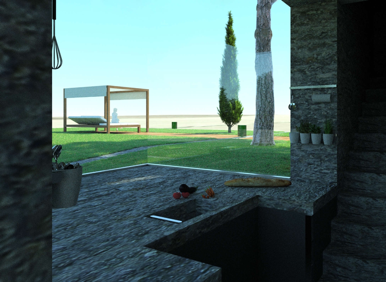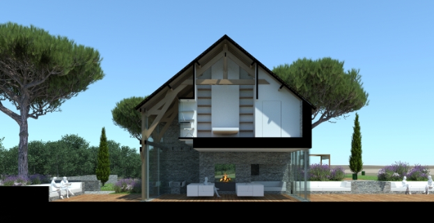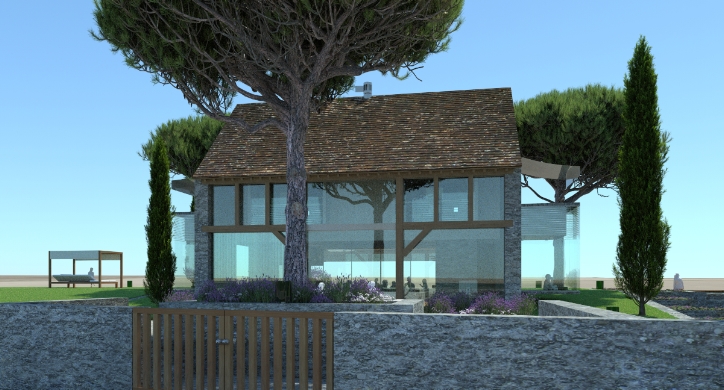 et au sud, entrouvert à l'est et à l'ouest Au nord et au sud, deux grandes baies ouvrantes A l'est une vue sur le paysage à travers la cheminée et la cuisine A l'ouest, une vue sur le bassin à travers l'atelier |