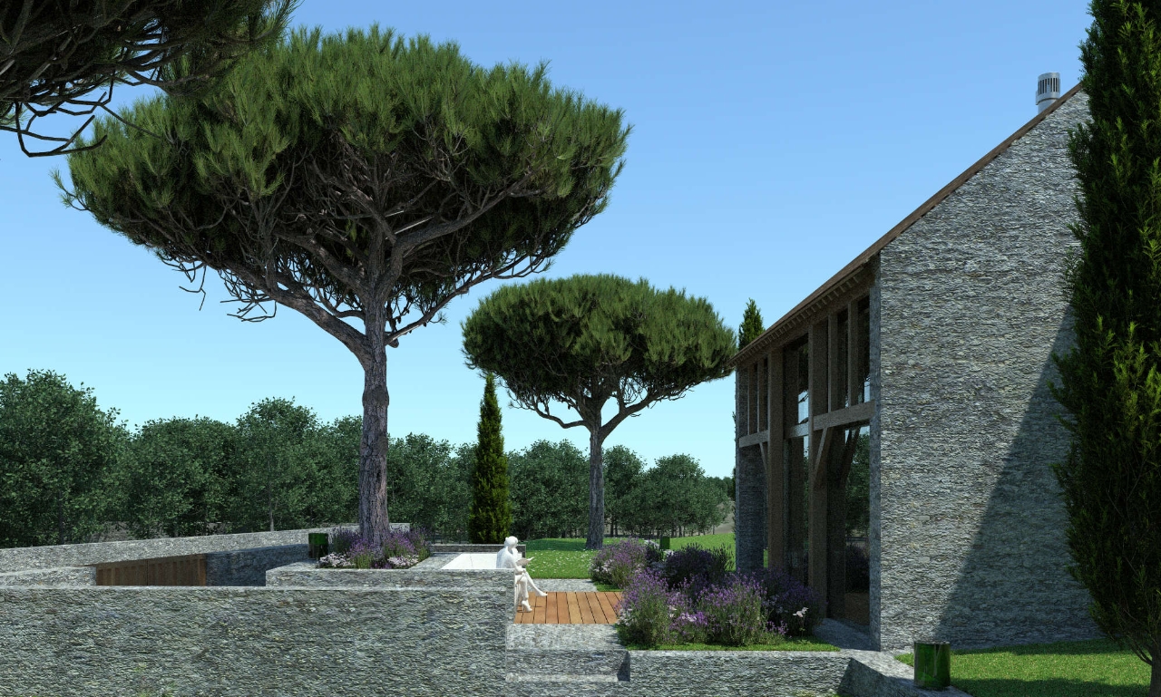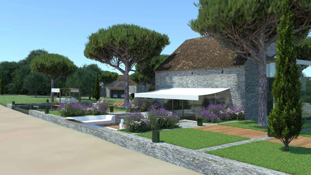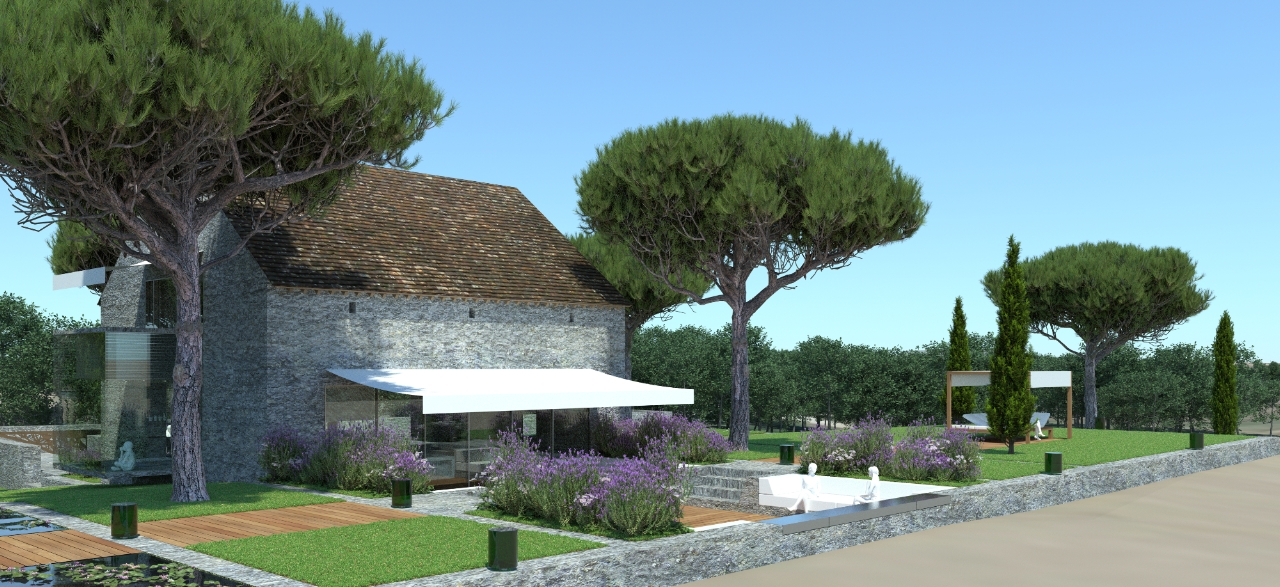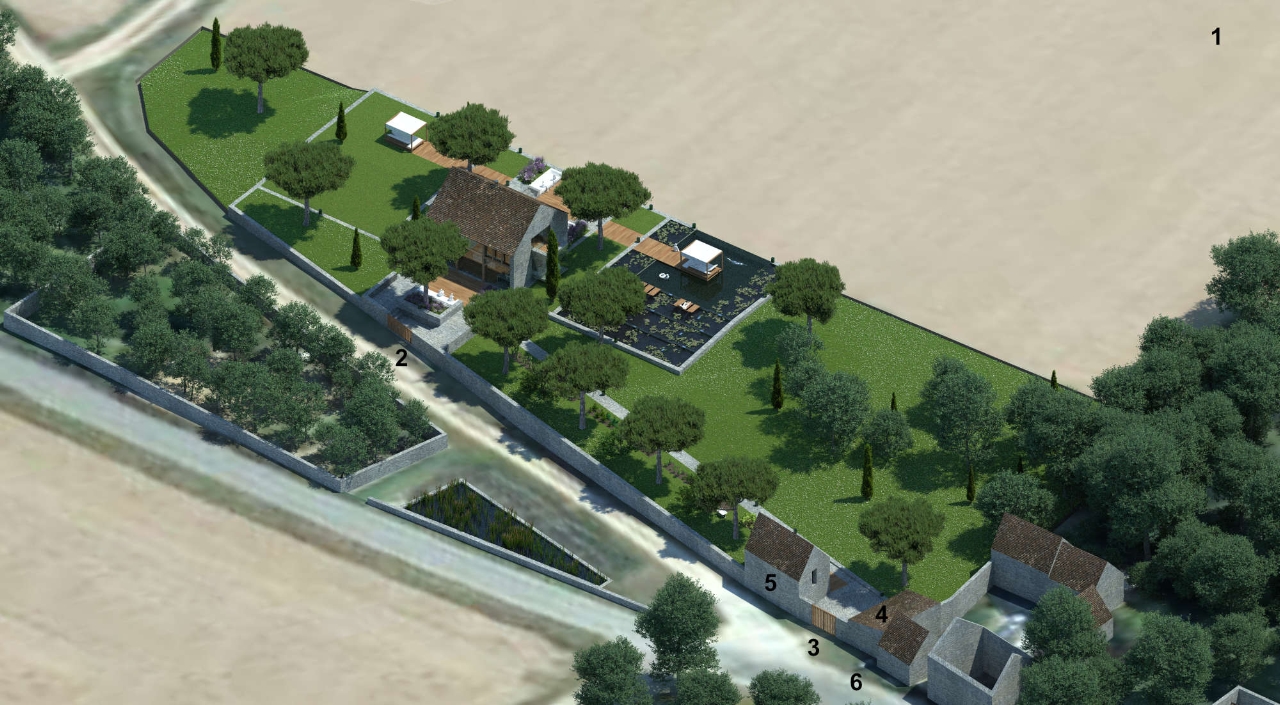 massifs de fleurs protège la maison des regards indiscrets Côté village, les deux bâtiments existant sont rénovés et servent de