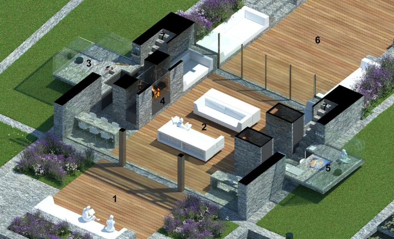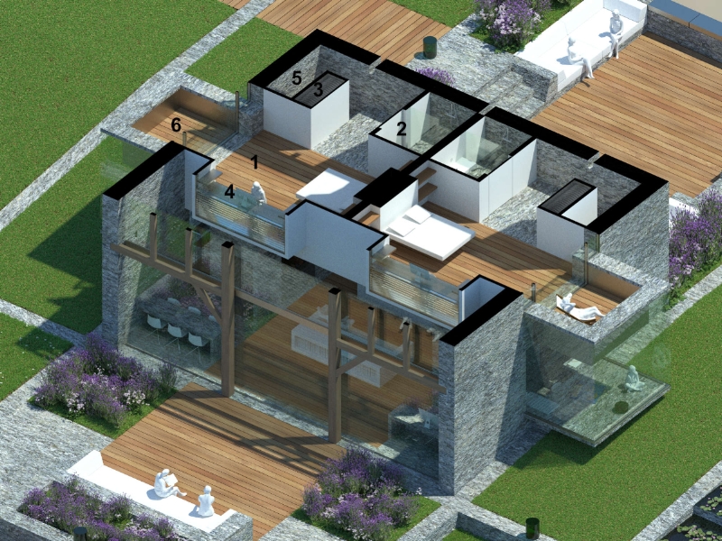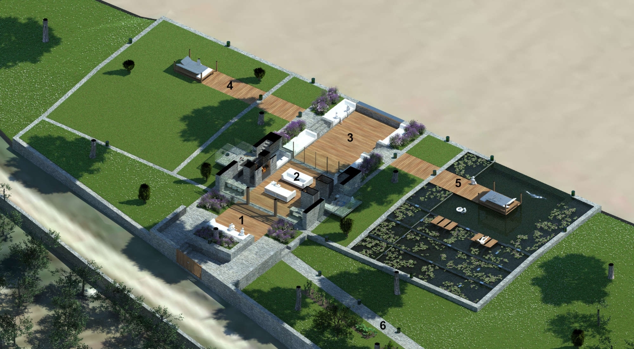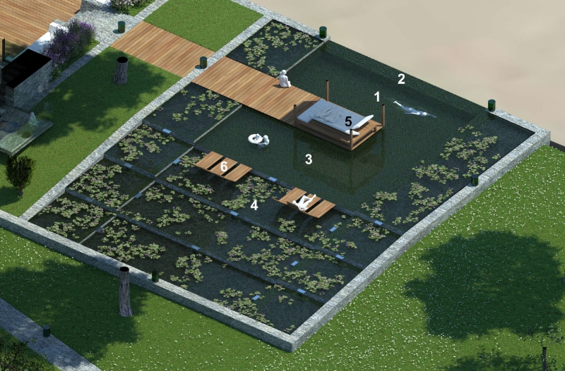 1 bassin de nage 2 débordement 3 bassin de barbotage 4 bassin de lagunage 5 pavillon de repos 6 solariums |
