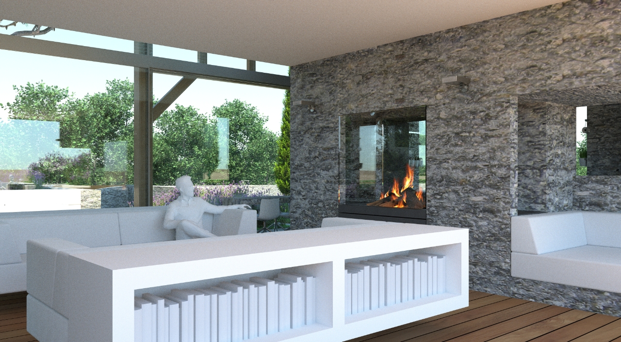 entre séjour, cuisine et paysage cheminée ouverte latéralement entre canapé dans son