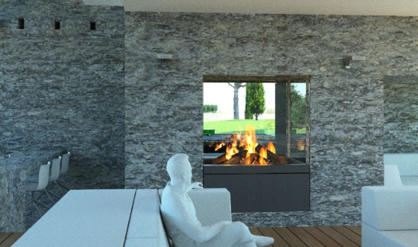 tous les côtés Comme le séjour la cheminée est ouverte sur 4 côtés Frontalement, elle laisse passer le regard entre la cuisine et le séjour Latéralement, elle laisse passer le regard entre le canapé dans son