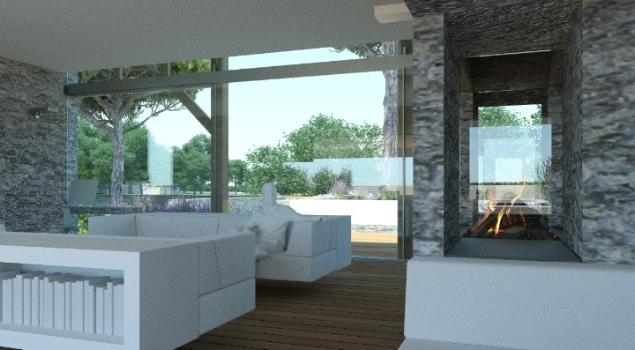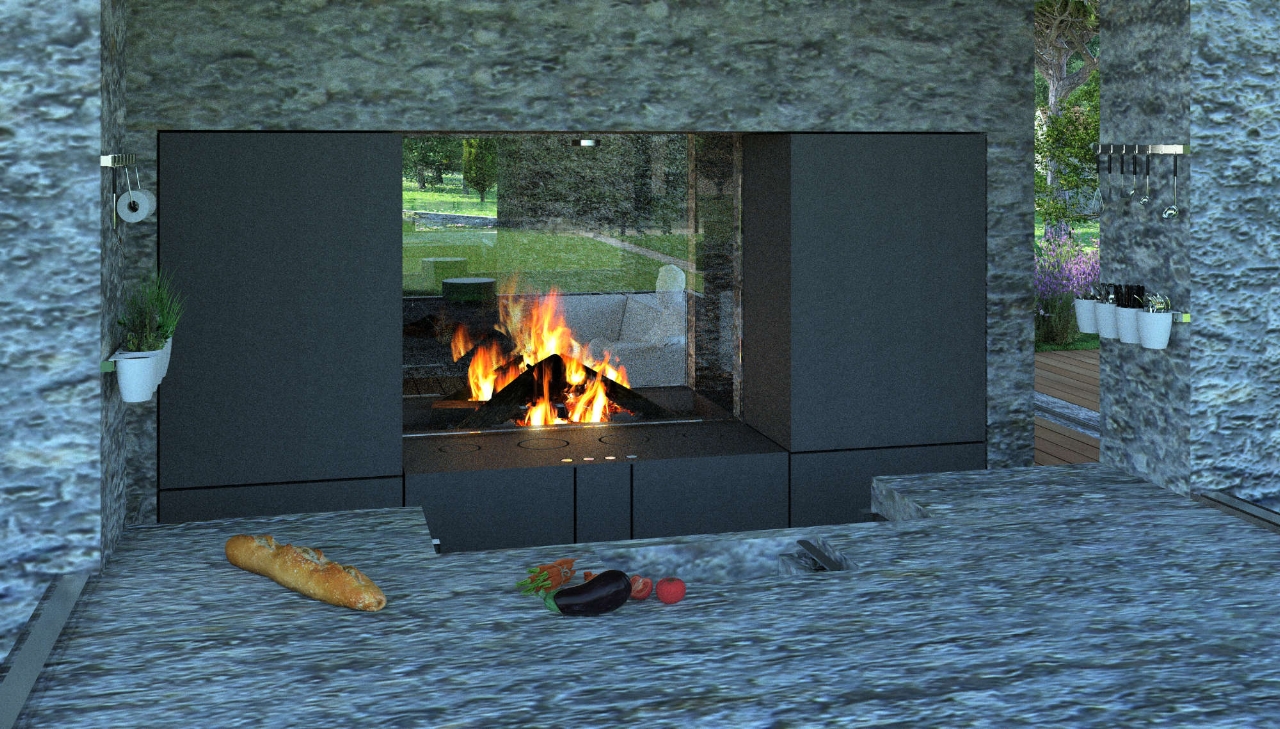 ouvert sur le jardin par de larges baies vitrées Le plan de cuisson laisse passer le regard à travers la cheminée