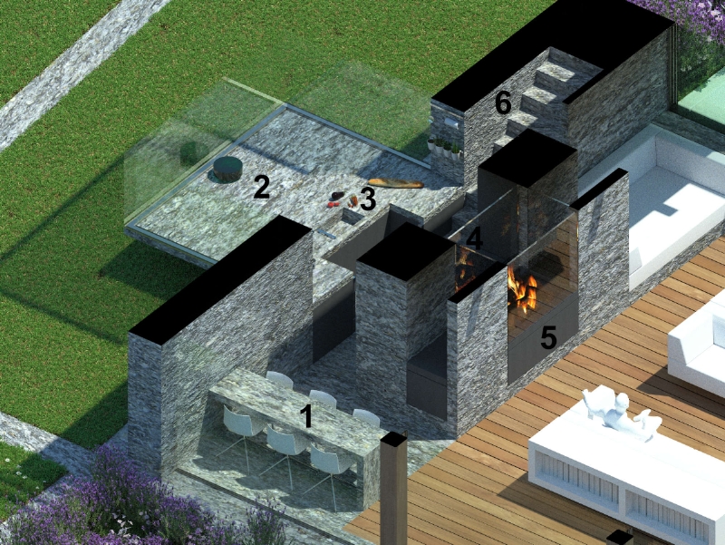 1 la table à manger 2 le grand plan de travail 3 l'évier 4 le plan de cuisson 5 la cheminée 6 l'escalier vers la chambre est |