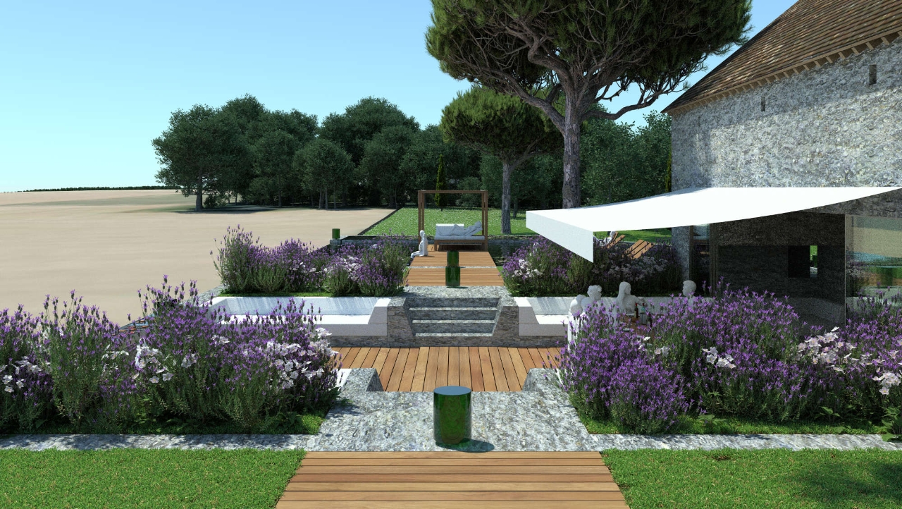 et terrasses Des prairies à l'est et à l'ouest Des terrasses au sud et au nord Un bassin à portée de mains