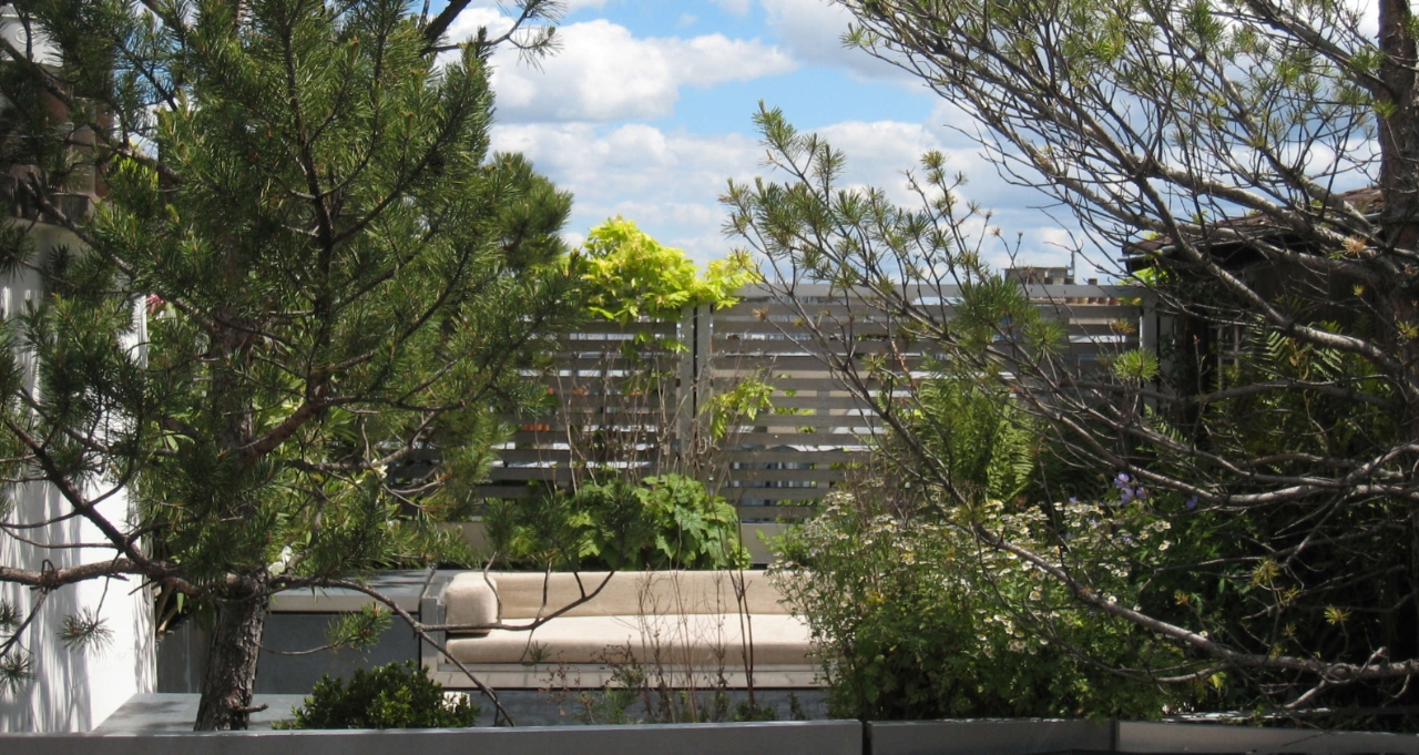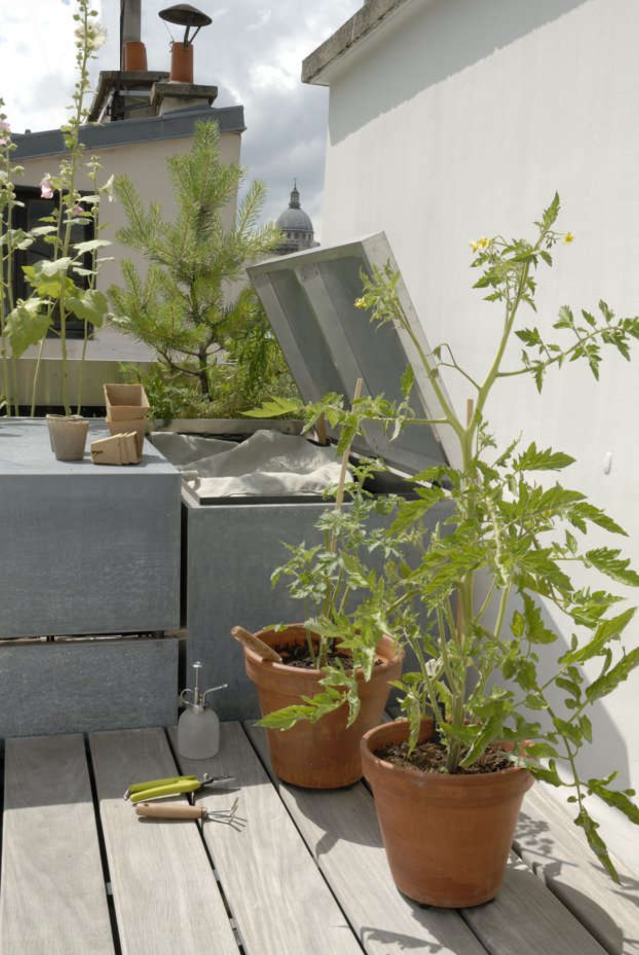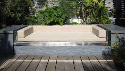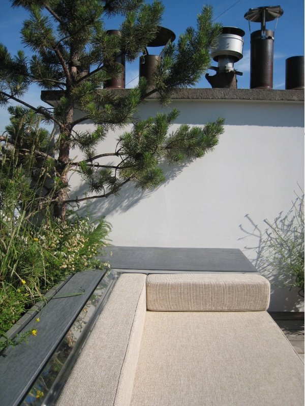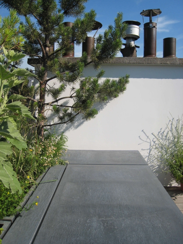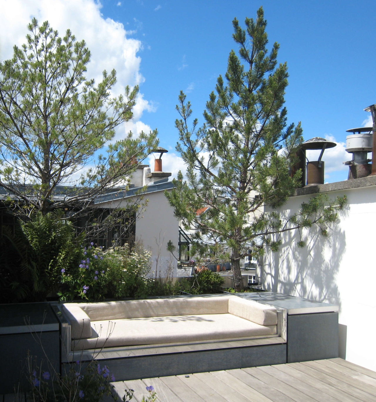 Une terrasse confortable et bien à l'abri Bien protégée par des persiennes côté rue et des plantes côté cour Pourvue de confortables canapés Une vrai pièce à vivre quand viennent les beaux jours |