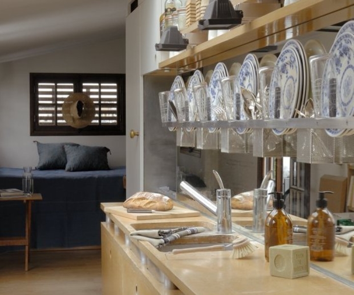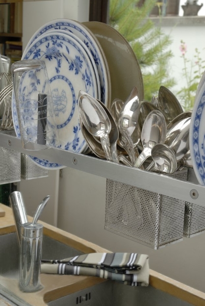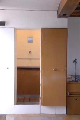 Une cuisine de poche La cuisine - d'une extrème minceur, un mètre de large avec le plan de travail - permet de jouir de la vue tout en préparant le repas Le vaisselier sert aussi de séchoir et la vaisselle n'a plus qu'à s'égoutter tranquillement et sans effort |