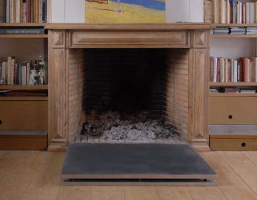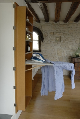 Côté hiver : une cheminée escamotable, une salle de bains de poche, une table à repasser dans une porte... Fini les courants d'air pernicieux et le triste spectacle des cendres froides : une fois le feu éteint, la plaque de cheminée se relève et libère complètement l'espace La table à repasser se déplie en un clin d'oeil depuis la porte de la salle de bains |