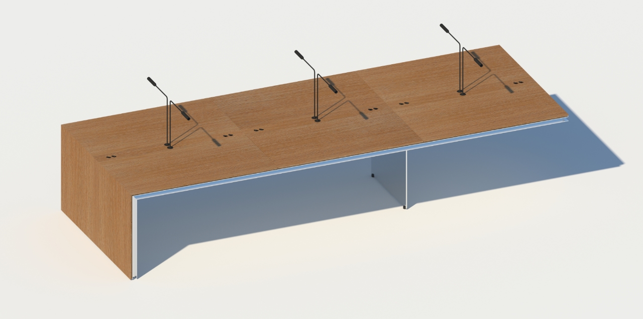 Un plateau de chêne plié sur un pied en aluminium Un plateau de chêne ourlé de métal et plié jusqu'au sol pour aller chercher les alimentations électriques Un pied avant en aluminium délicatement posé sur deux plots cylindriques |