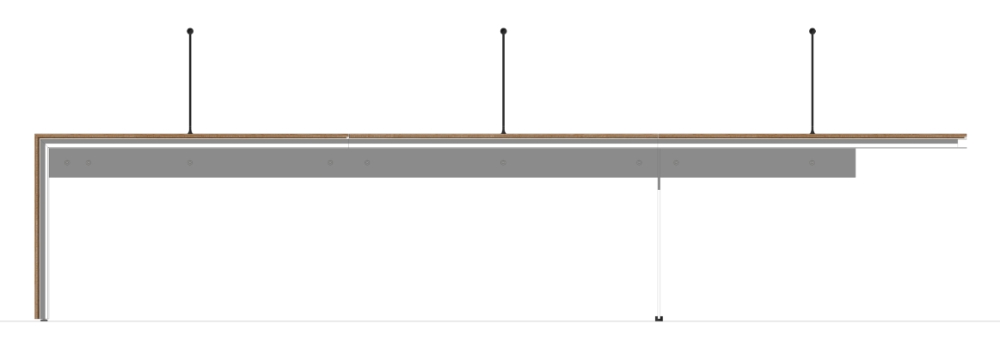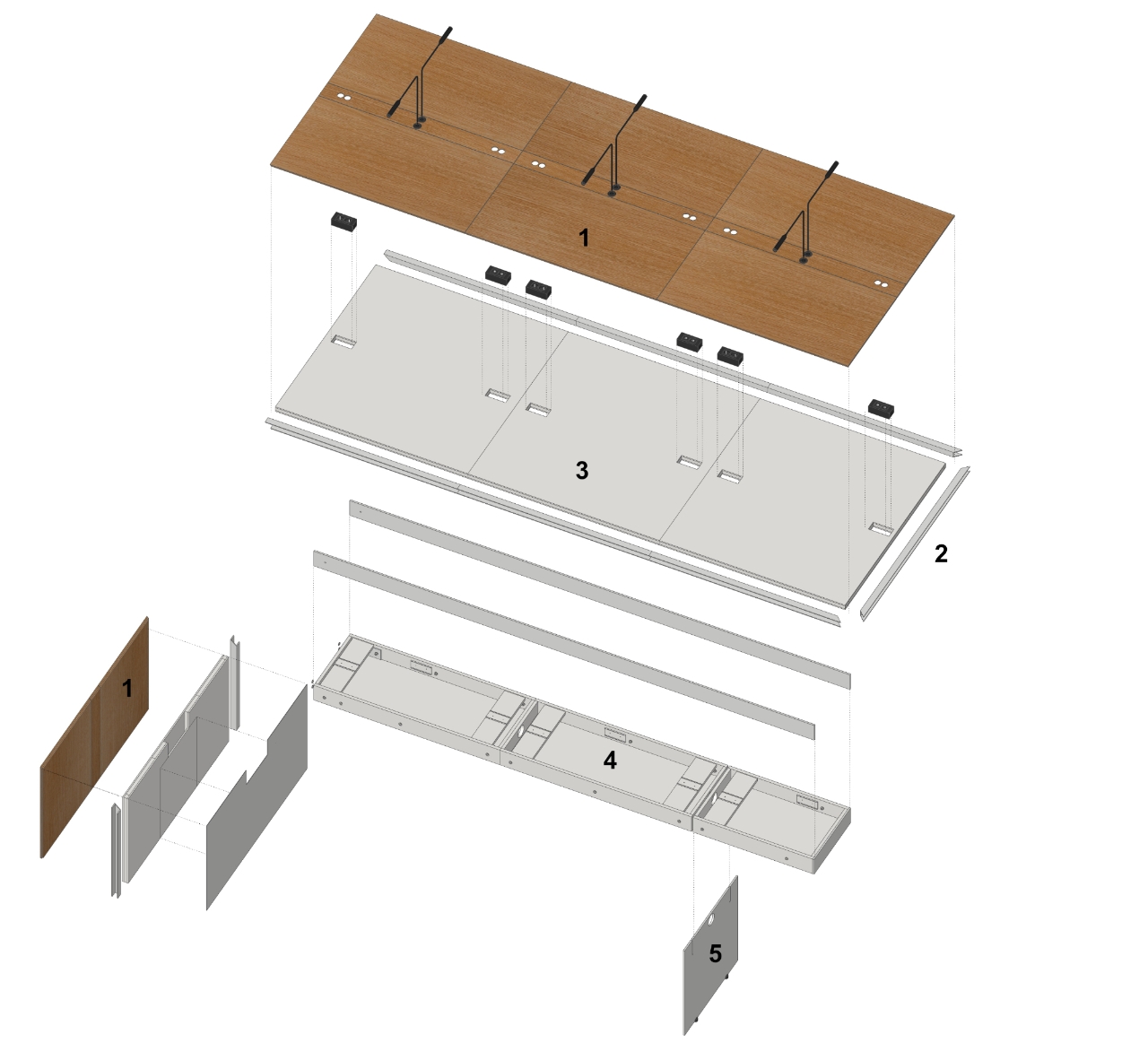 1 triplis chêne 2 profilés aluminium 3 panneaux support 4 gaine technique accessible 5 tôle forte aluminium |