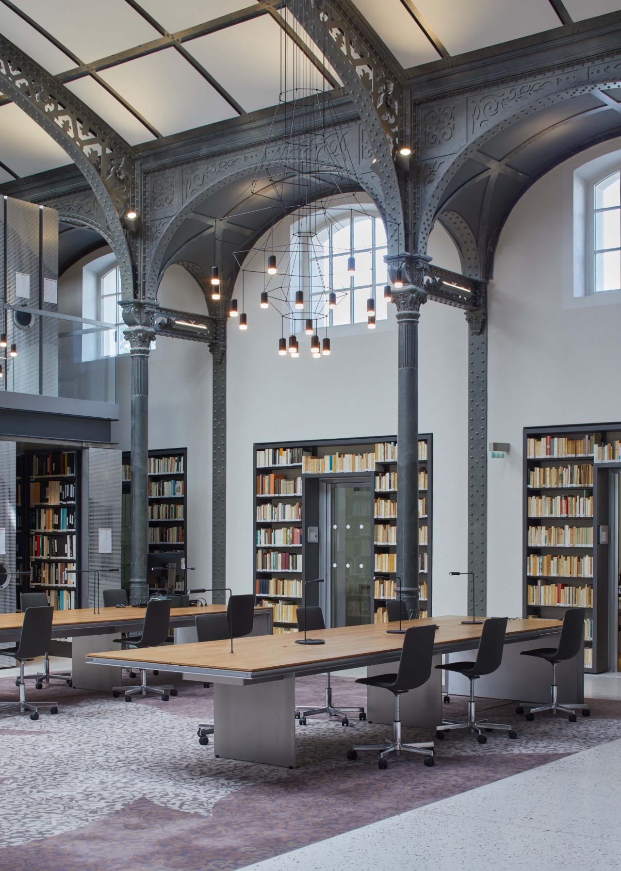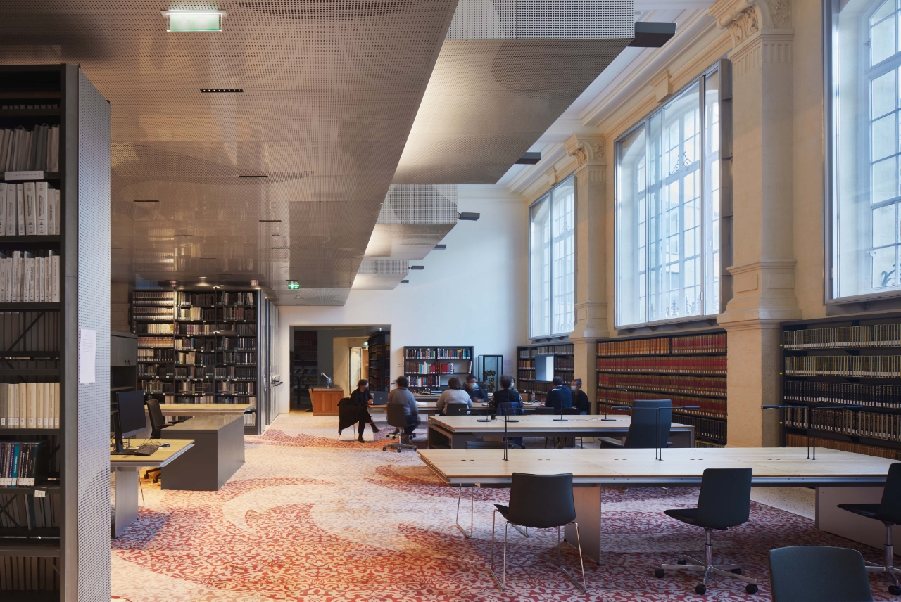 Des tables de lecture pour tous les usages Tables à 6 places pour la lecture des livres Tables à 4 places pour la lecture des documents précieux Tables à 1 place pour la lecture des plans Tables à 1 place pour le travail individuel en box carrel...